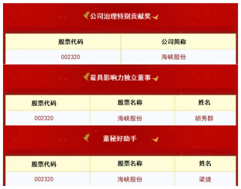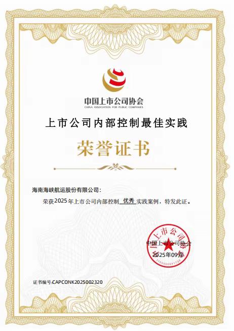 2025年三季度,海峡股份凭借扎实的经营实力与良好的资本市场形象斩获多项权威荣誉,充分彰显了监管机构、行业协会及市场各方对公司综合价值的高度认可。 董事会杂志“金圆桌奖”揭晓 海峡股份荣获三项大奖 作为中国公司治理领域的权威奖项,“金圆桌奖”由专业财经期刊《董事会》杂志发起并组织评选,海峡股份荣获第二十届中国上市公司董事会金圆桌奖“公司治理特别奖”“最具影响力独立董事”“董秘好助手”三项大奖。 其中“公司治理特别奖”旨在表彰在新质生产力引领下,公司治理良好、董事会建设具有表率并取得良好业绩的上市公司,公司凭借在治理领域的系统性与突破性贡献获此殊荣。同时,公司独立董事因其独立治理对公司稳健发展的关键价值、证券事务工作人员也因专业能力为公司治理助力分别获奖。 全球客滚龙头ESG再获肯定 海峡股份获“英华奖”A股ESG示范案例奖 近期,由《中国基金报》主办的2025中国上市公司英华示范案例评选结果正式揭晓,海峡股份以在环境、社会及治理(ESG)领域的系统化实践与行业标杆表现,成功斩获中国基金报“A股ESG示范案例奖”。 英华奖作为资本市场极具公信力的权威评选,依托资管领域专业优势,从ESG治理架构、实践成效、信息披露及行业示范力等多维度严苛考评。获此殊荣不仅标志着公司ESG管理水平获得资本市场高度认可,更彰显了其在客滚运输行业可持续发展中的引领地位。 内控赋能琼州海峡疏堵保畅 海峡股份斩获中国上市公司内部控制最佳实践优秀案例奖 由中国上市公司协会在财政部会计司、中国证监会会计司指导下组织的2025年中国上市公司内部控制最佳实践活动结果正式公布,海峡股份申报的《跨海电动汽车滚装运输疏堵对策——关于琼州海峡治理实践》案例凭借精准的风险管控、创新的机制设计与显著的实施成效,成功斩获“优秀案例奖”。 本次评选旨在挖掘和推广国内上市公司内控建设的先进经验,树立行业标杆,发挥优秀案例示范作用,进一步增强上市公司高质量发展的内生动力。获奖案例既是对公司“安全第一、效率优先”发展理念的生动诠释,更是对投资者利益保障能力的有力证明,彰显了公司在客滚运输领域风险治理的标杆价值。 海峡股份的成长离不开广大投资者与社会各界的信任与支持,公司将始终以合规经营为基石,以价值创造为核心,以投资者回报为己任,持续提升核心竞争力与资本市场认可度,与各位投资者及社会各界携手共筑长期价值,共享发展红利。 | |||||||